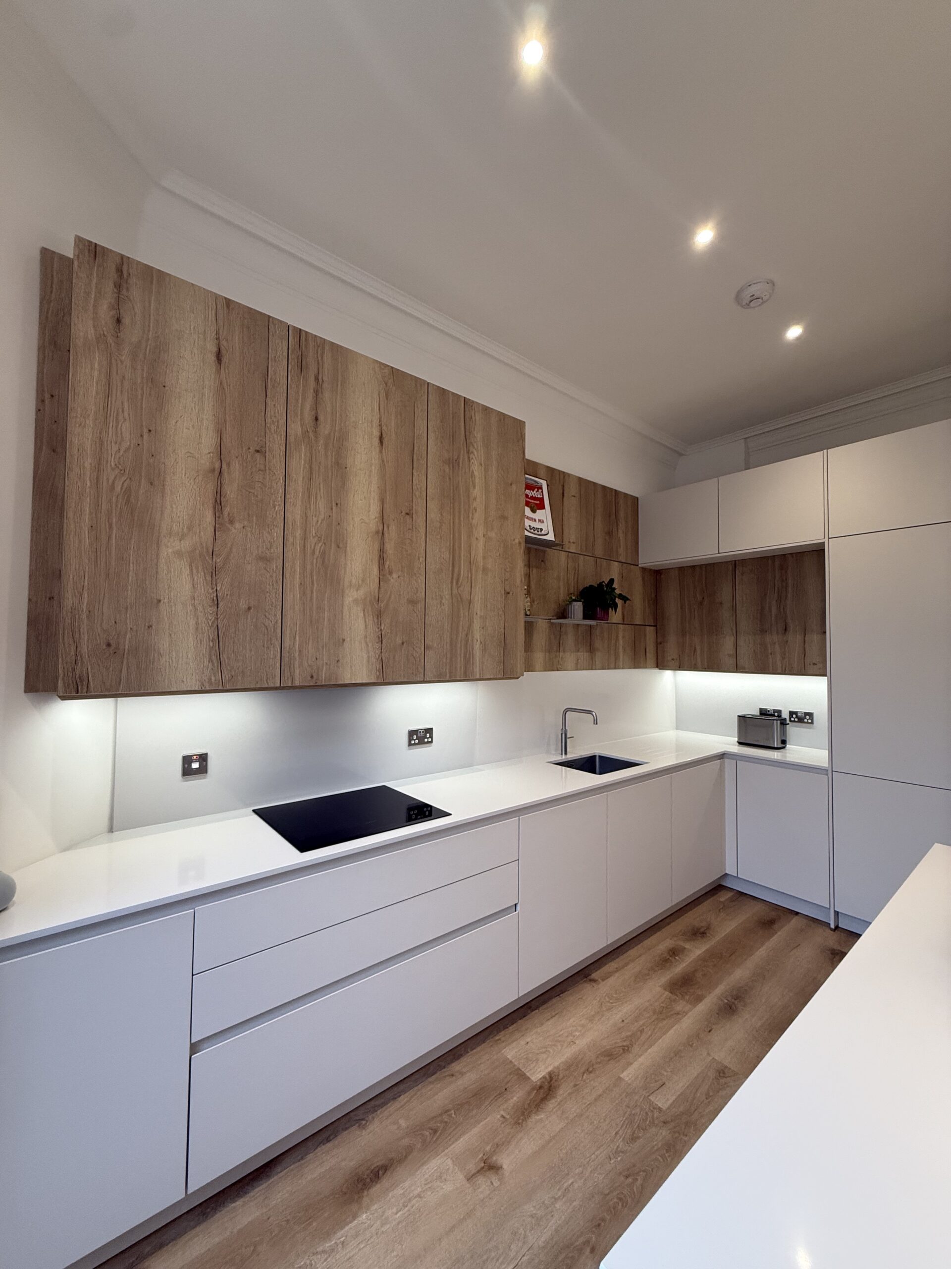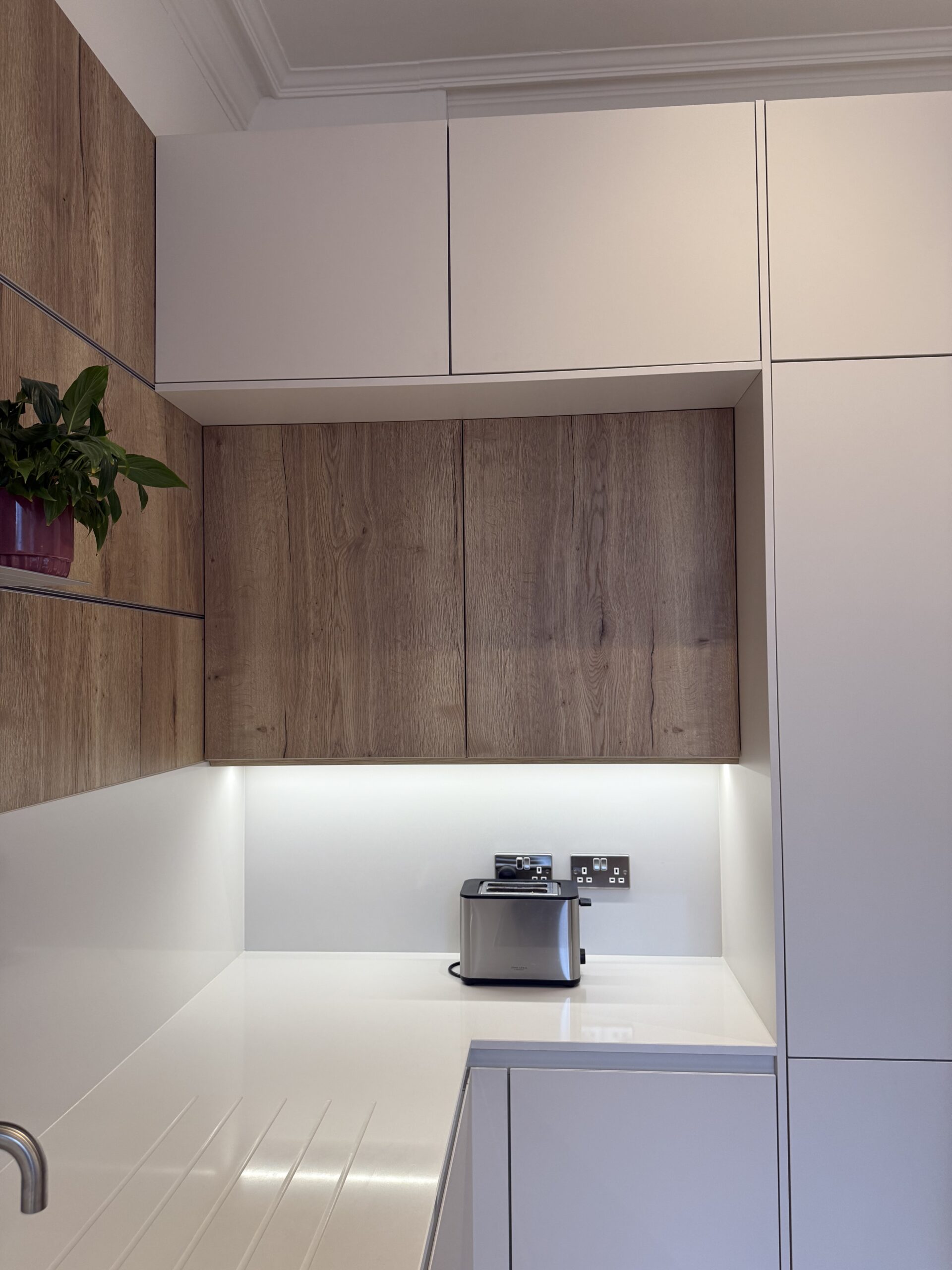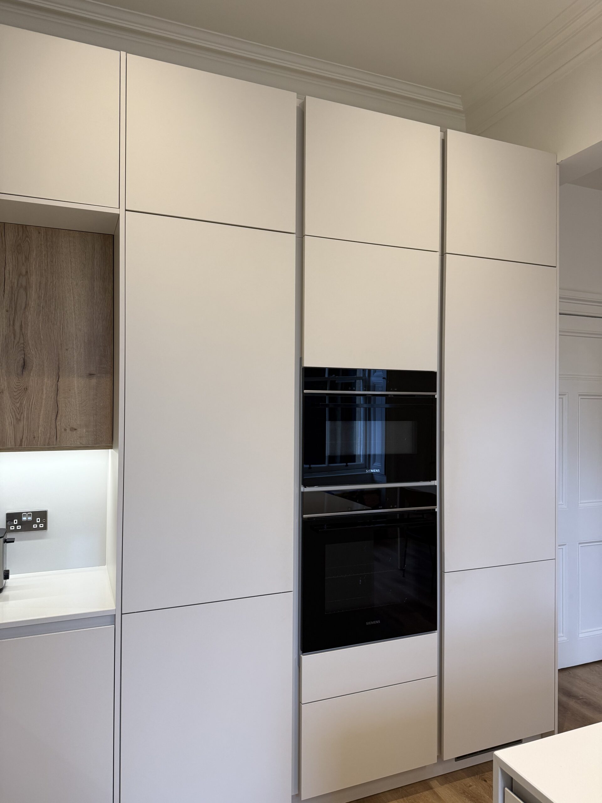 Tall cabinetry in Ultra Matt Angora Grey is paired with Oak Marcato cabinetry to add depth and natural contrast, while a Silestone Miami White worktop provides a crisp, seamless finish across the space. Integrated Siemens appliances are neatly concealed within the layout, maintaining clear sightlines and a streamlined aesthetic throughout.