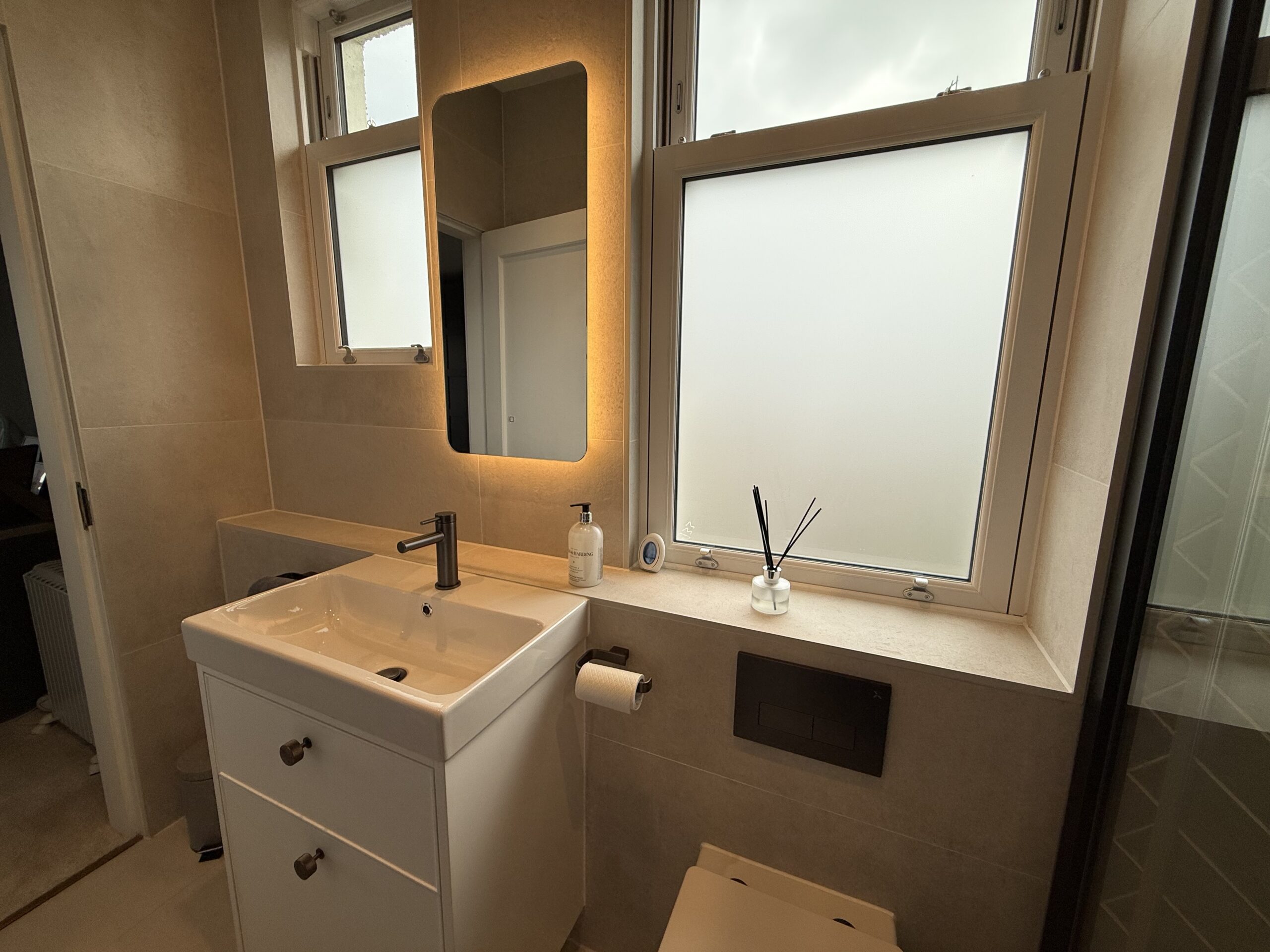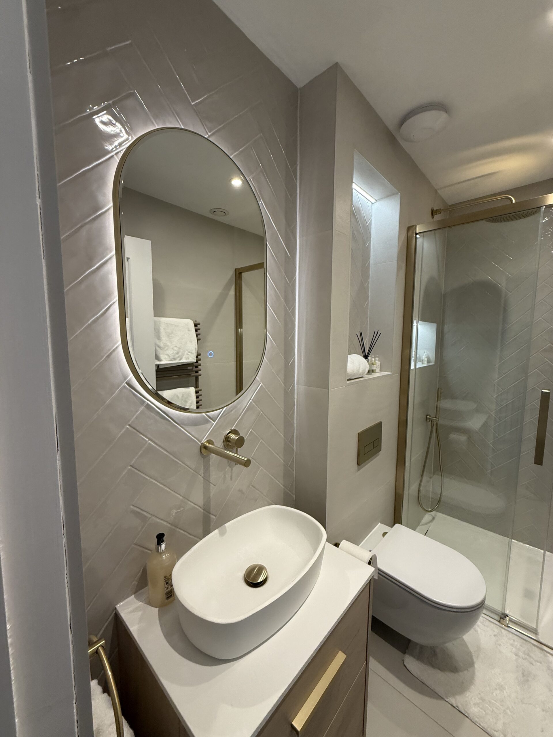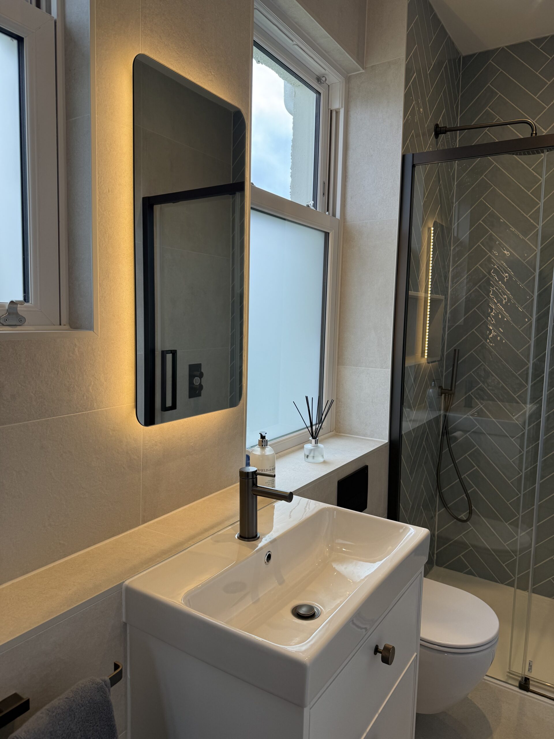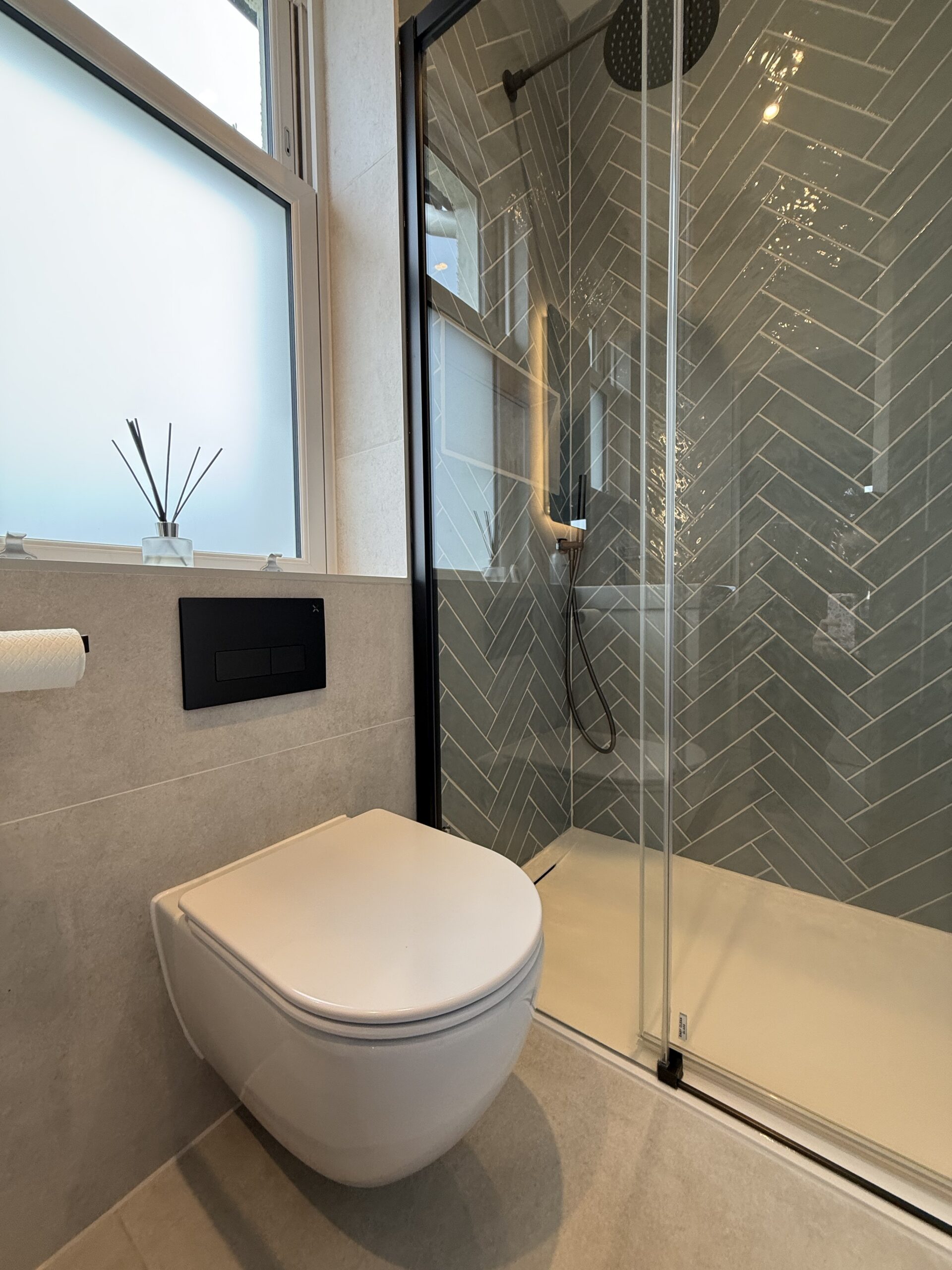 This en-suite combines clean contemporary design with striking contrast through soft neutral wall tiles  and deep green herringbone shower  tiles. A compact vanity unit and illuminated mirror keep the space feeling light and functional, while gunmetal brassware and accessories add a bold modern touch. The walk-in shower with sliding glass  door completes the room, creating a stylish and practical en-suite that maximises the space beautifully.