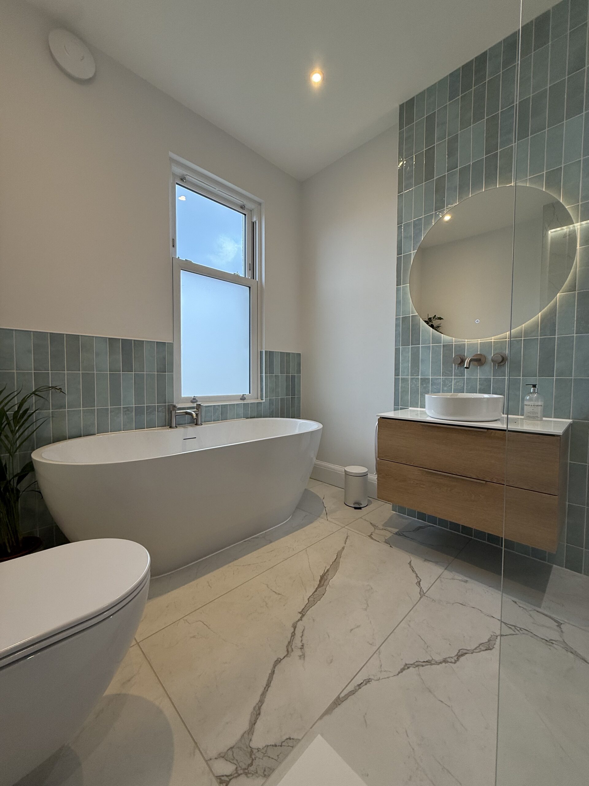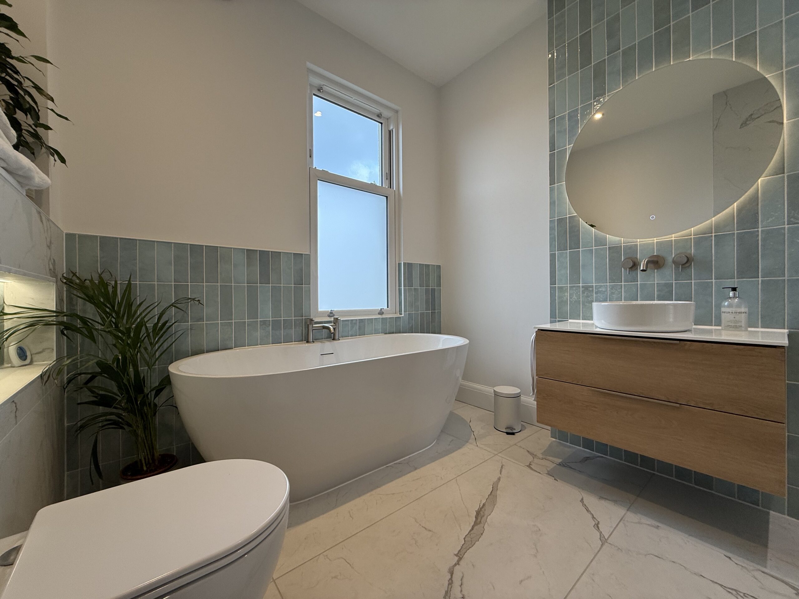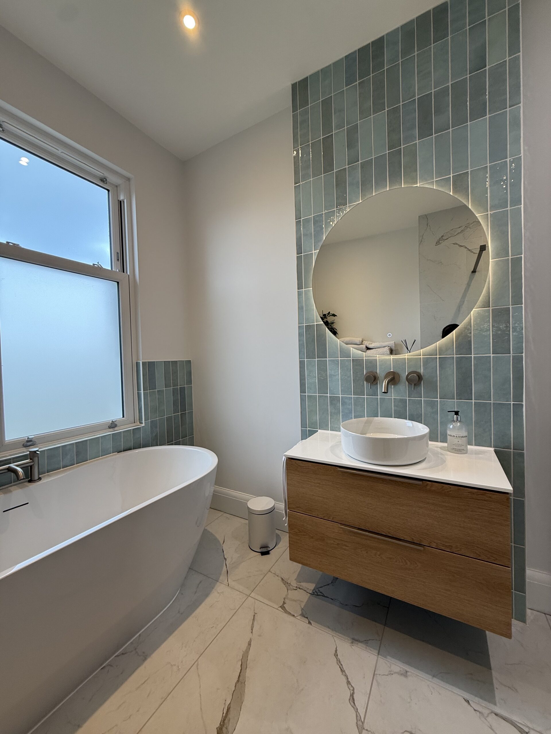 The first floor bathroom was designed as a bright and relaxing family space, centred around a freestanding bath positioned beneath the window to create a calm focal point. Soft  aqua wall tiles  bring subtle colour to the room and complement the warm Danish oak wall-mounted vanity  unit, while brushed nickel brassware and a circular illuminated mirror  add a clean contemporary finish. Large format marble-effect floor tiles  help tie the space together, creating a light and refined bathroom that balances comfort with modern design.