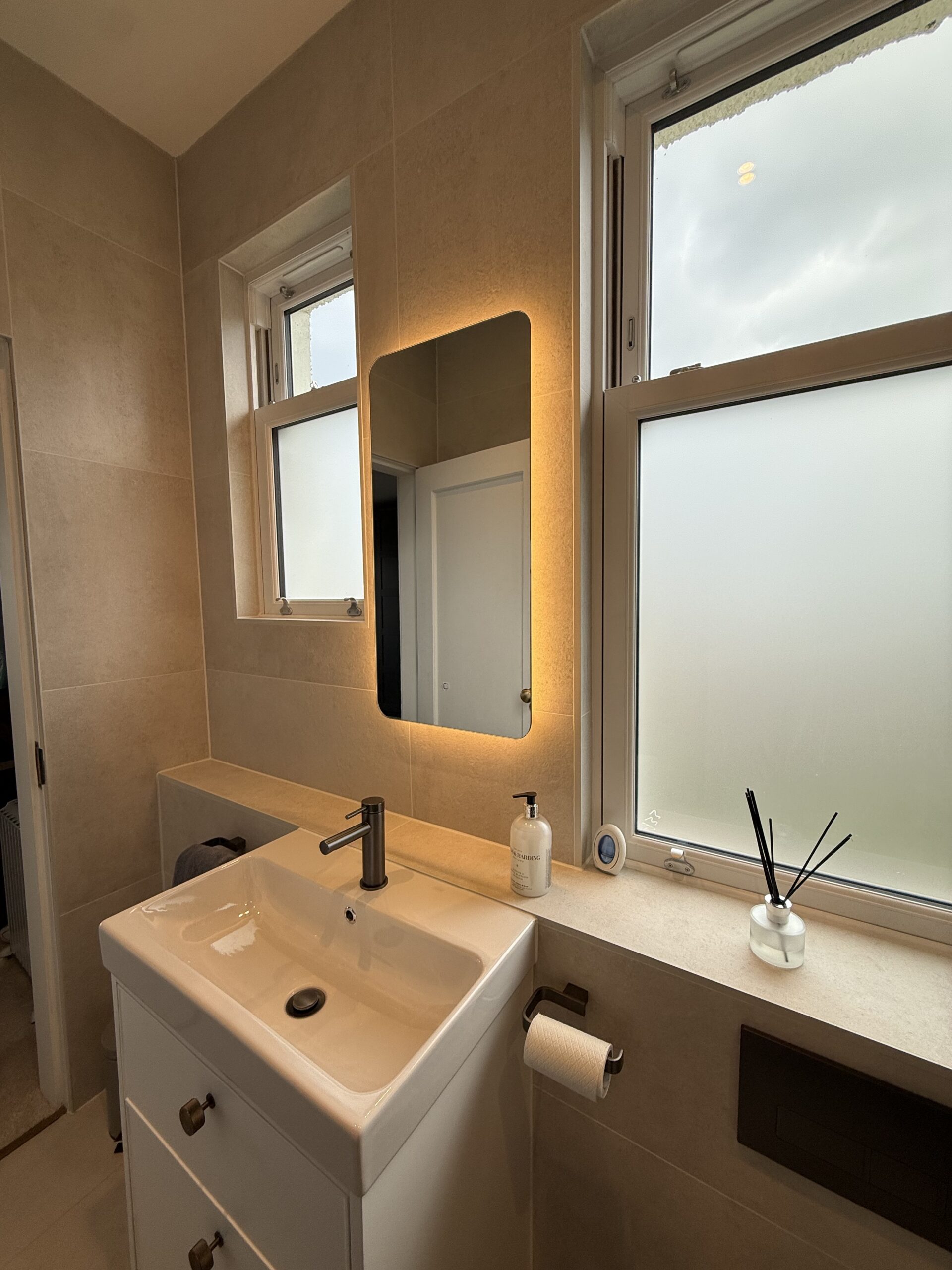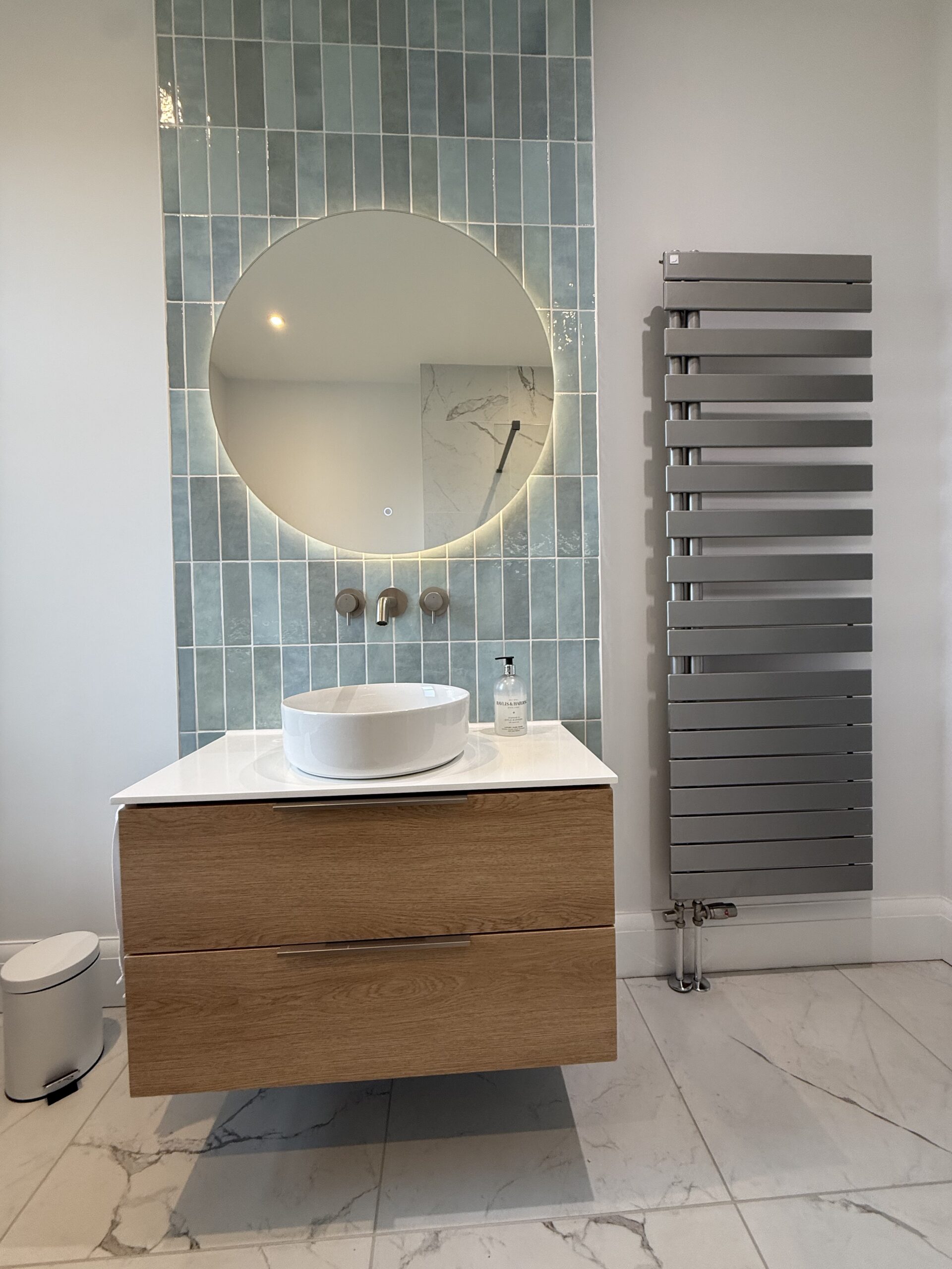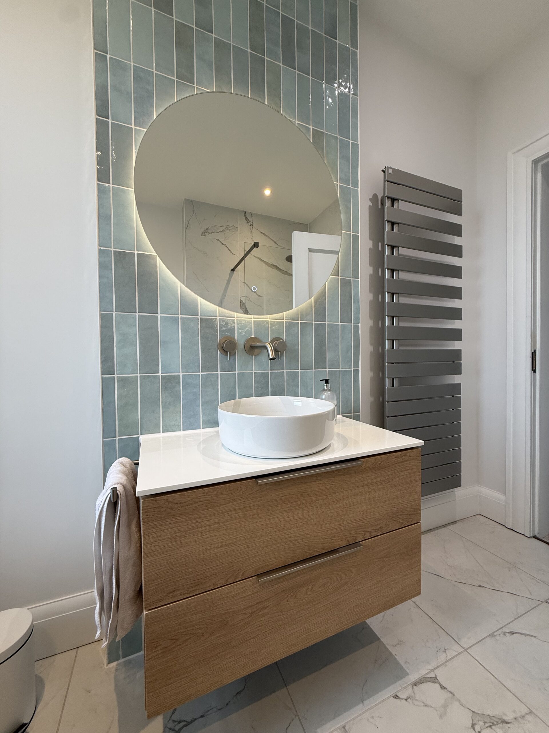 The first floor bathroom was designed as a bright and relaxing family space, centred around a freestanding bath positioned beneath the window to create a calm focal point. Soft  aqua wall tiles  bring subtle colour to the room and complement the warm Danish oak wall-mounted vanity  unit, while brushed nickel brassware and a circular illuminated mirror  add a clean contemporary finish. Large format marble-effect floor tiles  help tie the space together, creating a light and refined bathroom that balances comfort with modern design.