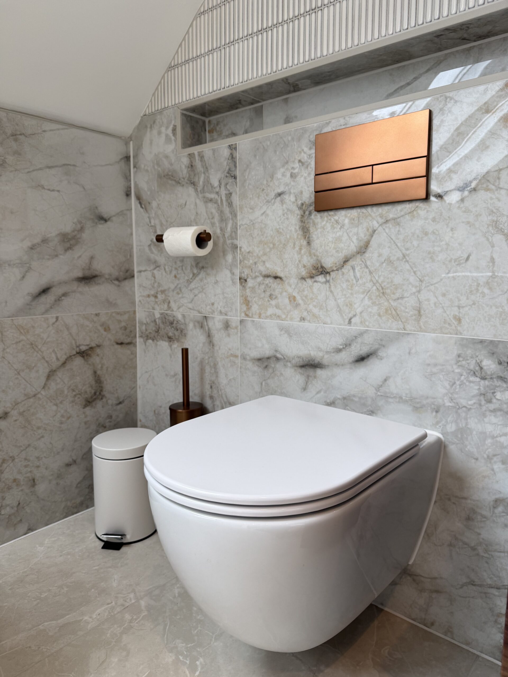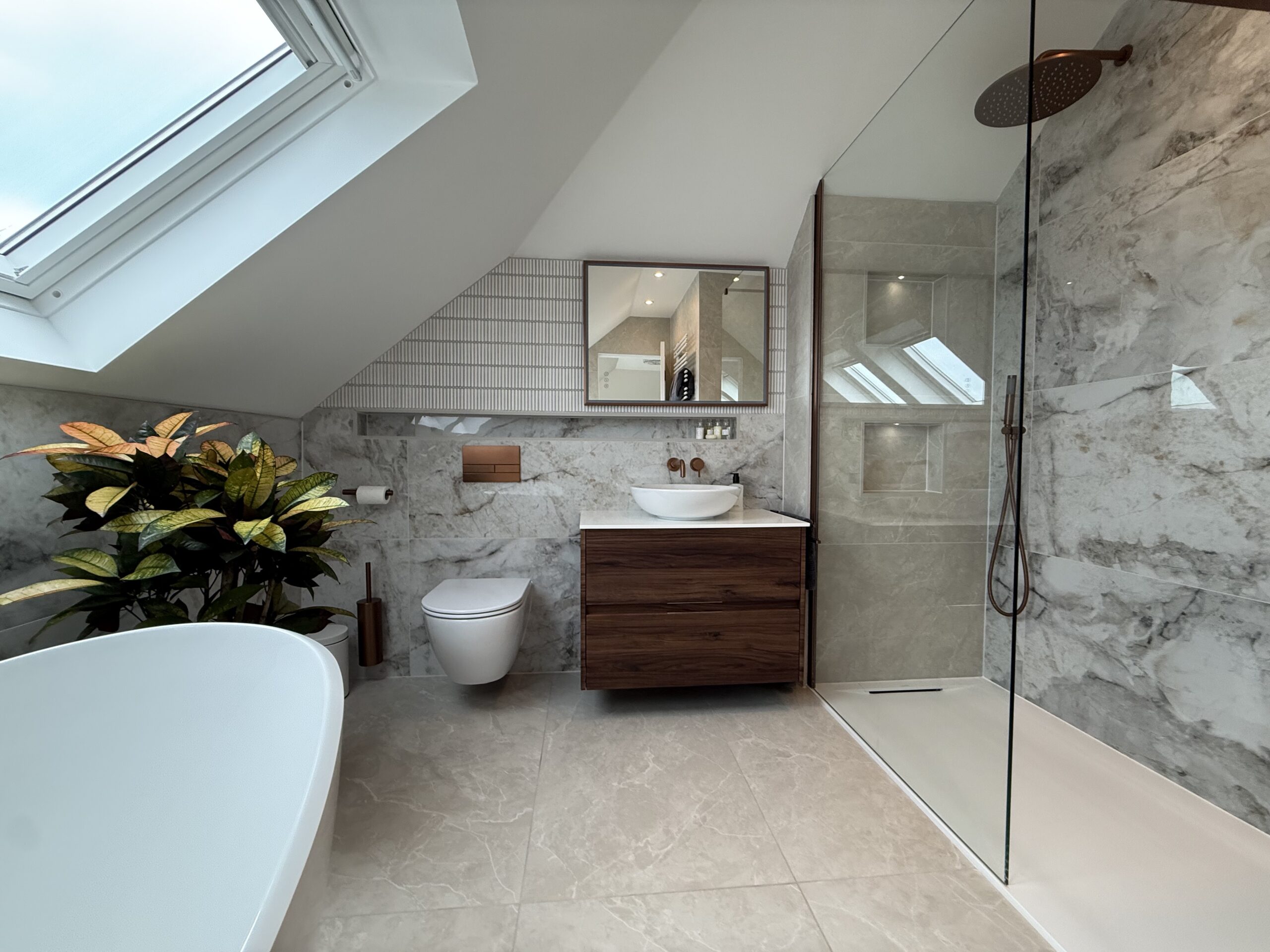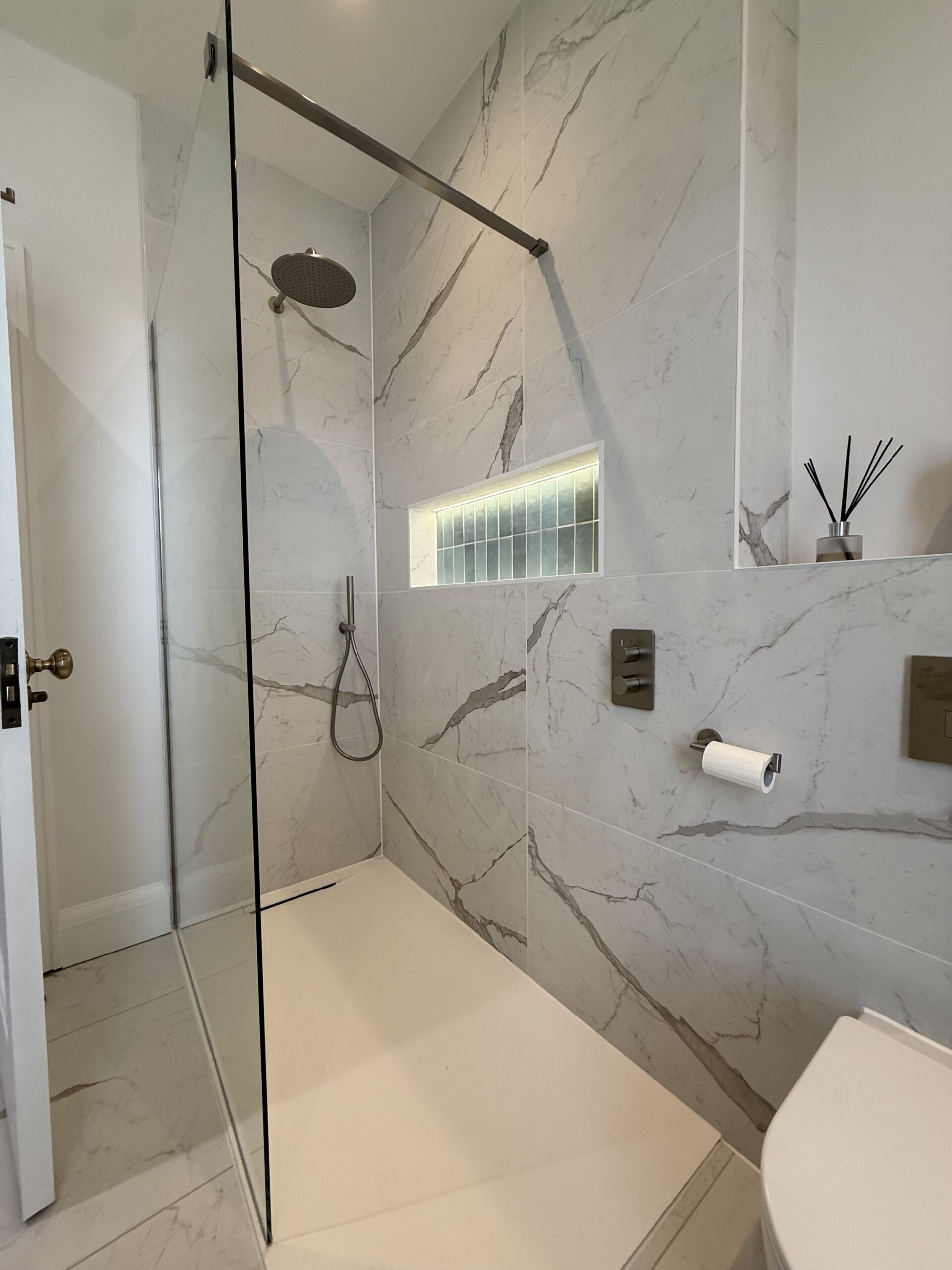 The project included a spacious first floor family  bathroom, three individual en-suite  bathrooms, and a ground floor shower room. Each space was thoughtfully designed to suit its setting within the property while maintaining a consistent level of quality, finish, and functionality across all five bathrooms.