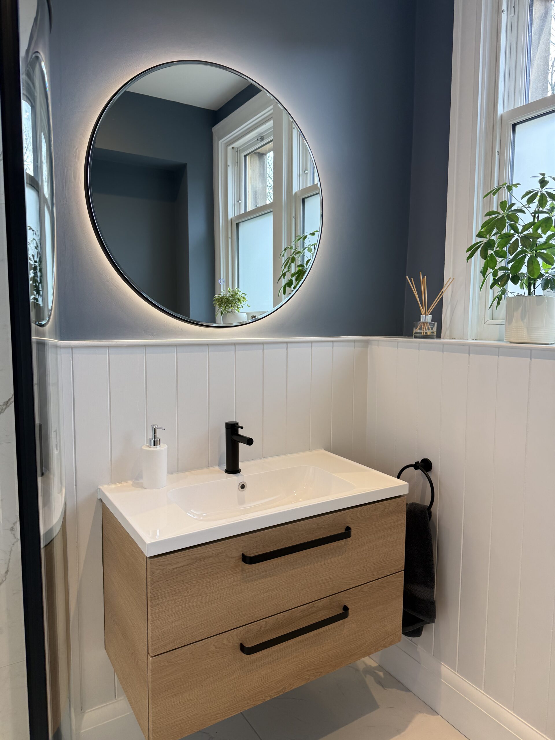The ground floor shower room was designed to be both practical and stylish, featuring a contemporary palette of deep blue walls, crisp white panelling  and marble-effect shower  tiles. A curved quadrant shower enclosure helps maximise the available space, while the Danish oak vanity unit  adds warmth and contrast against the bold matt black brassware and  accessories. Finished with a large illuminated mirror, the room delivers a modern and welcoming shower space for everyday use.