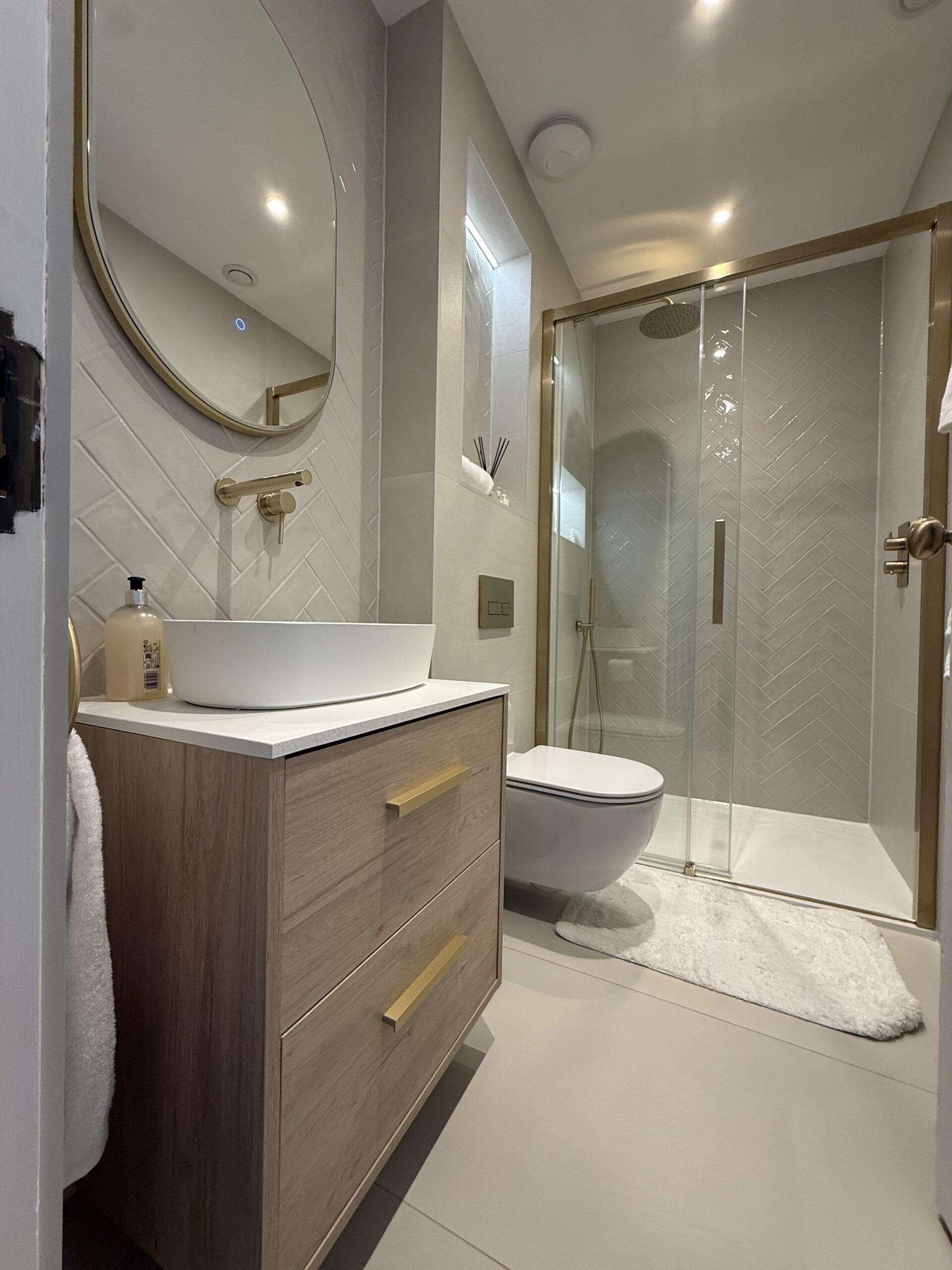 The guest en-suite features a clean and elegant design, combining soft neutral tiles  with warm brushed brass finishes  to create a welcoming space. A light  oak wall-hung vanity  unit with vessel basin adds warmth and texture, while the brushed brass shower  enclosure, brassware and accessories introduce a refined contrast. Finished with a pill-shaped mirror  and walk-in shower, the room offers a stylish and comfortable bathroom for guests.