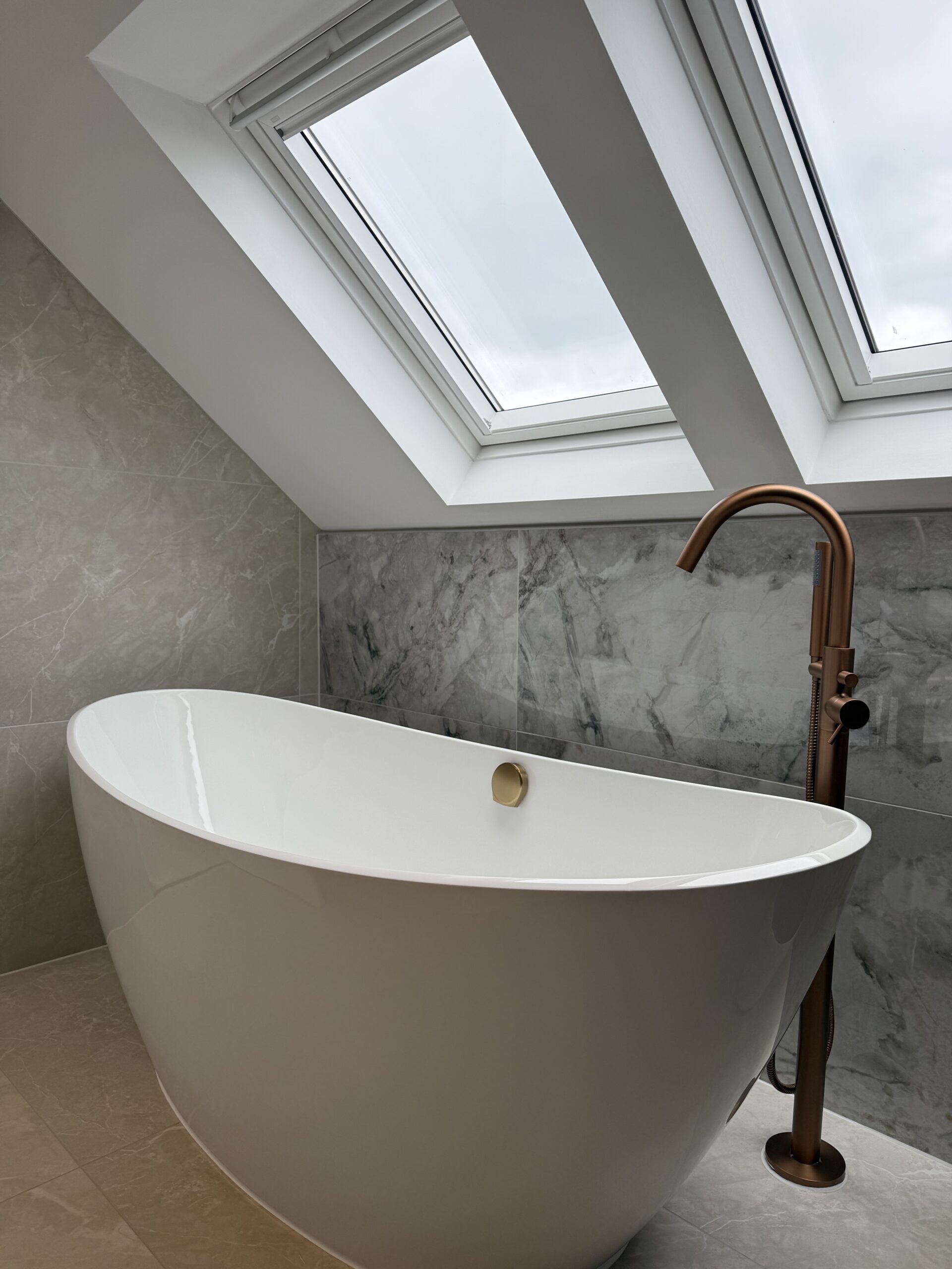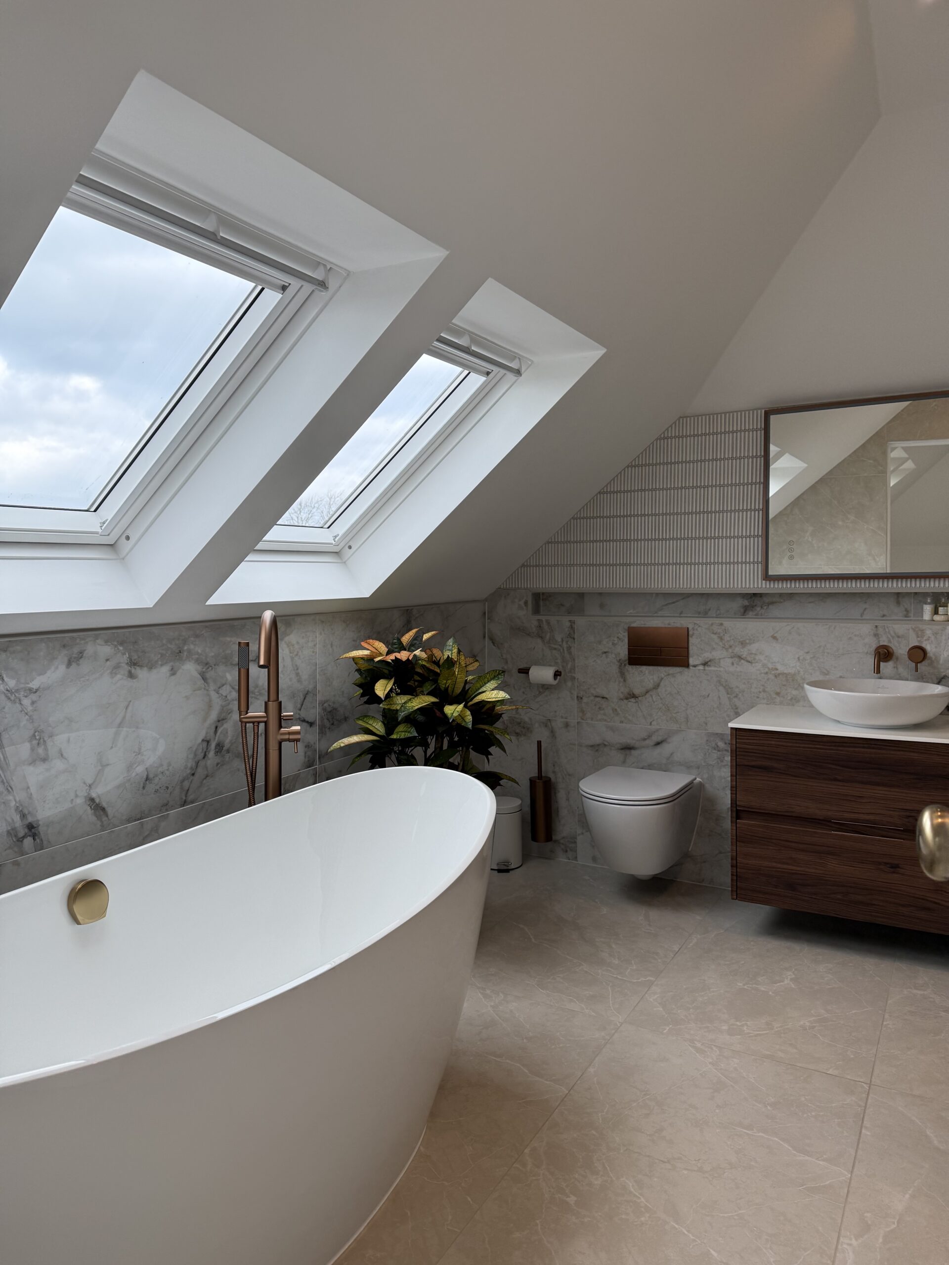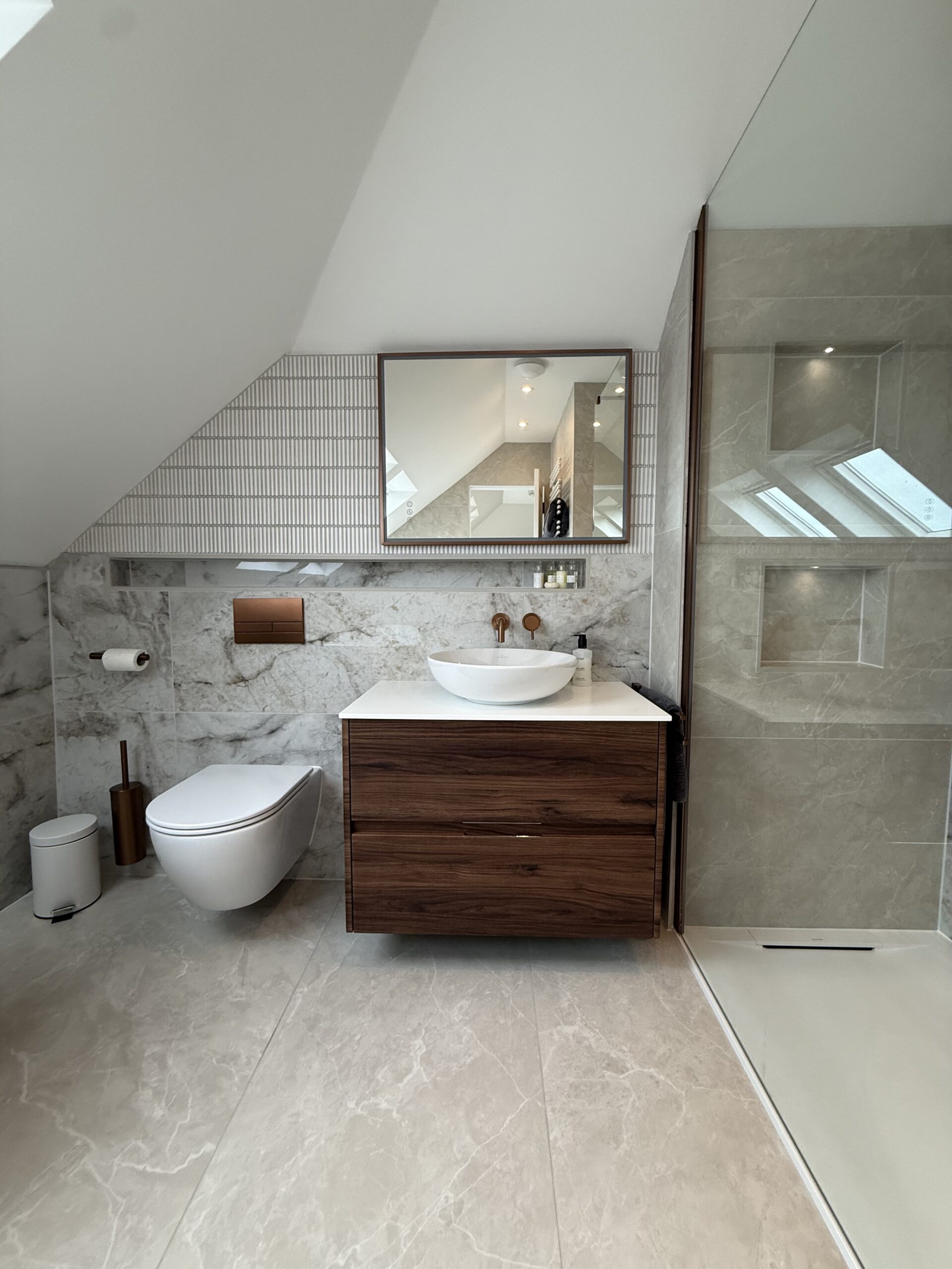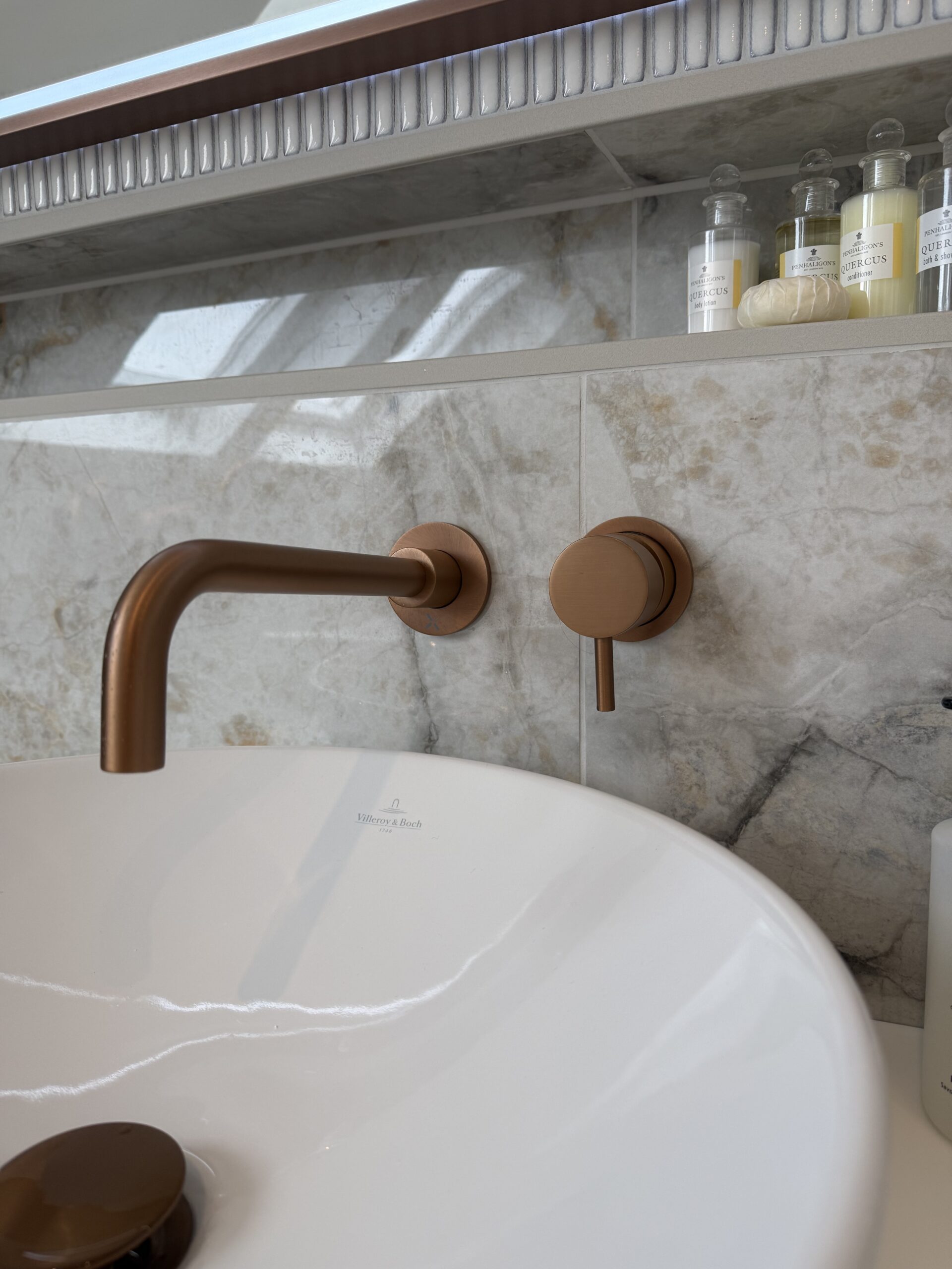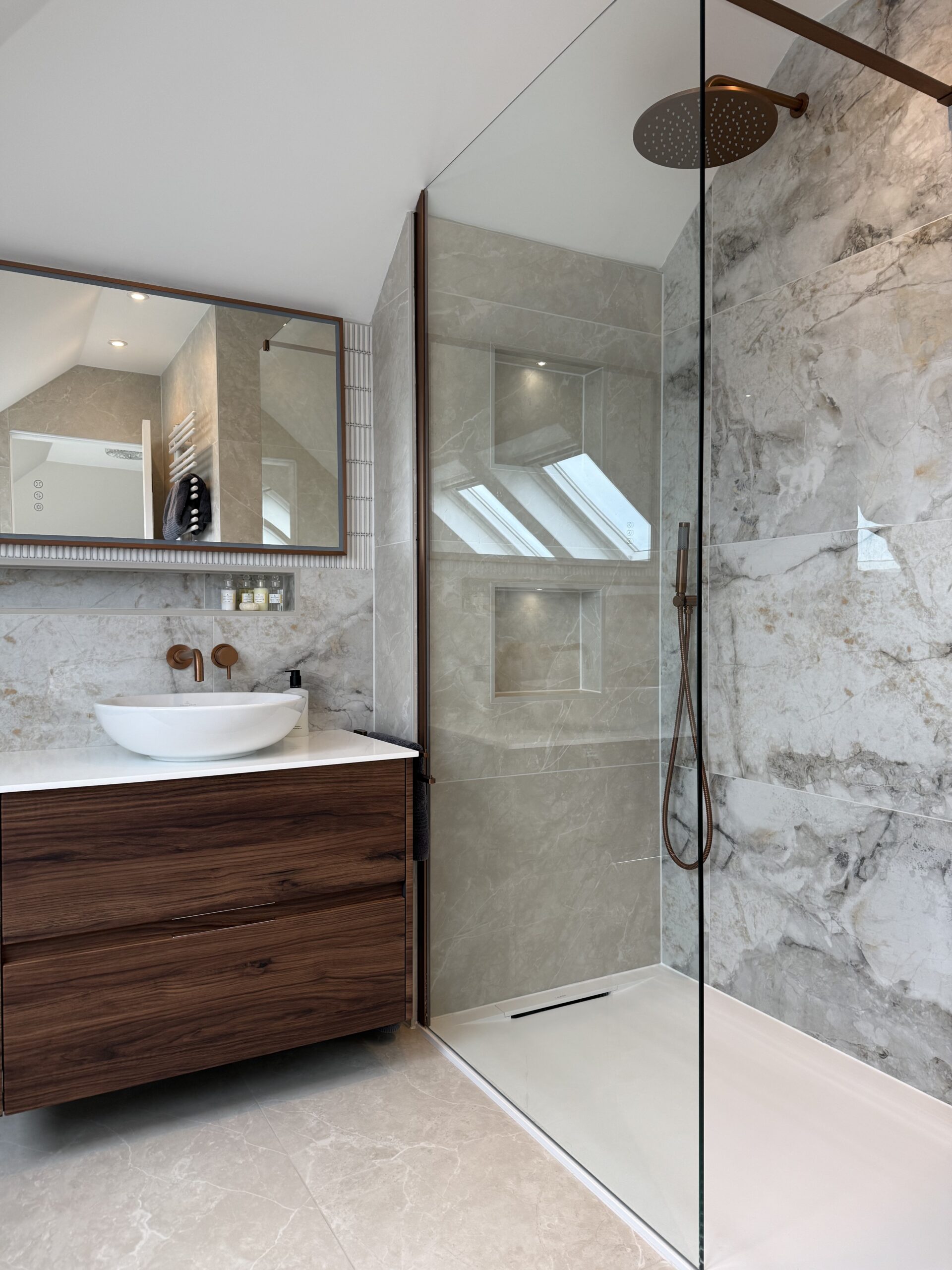 The master en-suite was designed as a luxurious and calming retreat, combining natural textures with warm bronze finishes. A freestanding bath  and walk-in shower  create a spa-like feel, complemented by marble-effect tiling  and a warm wood vanity unit that adds depth and contrast. Brushed bronze  brassware, a wall-mounted basin mixer and an illuminated mirror  complete the space, bringing a refined and contemporary finish to this elegant en-suite.