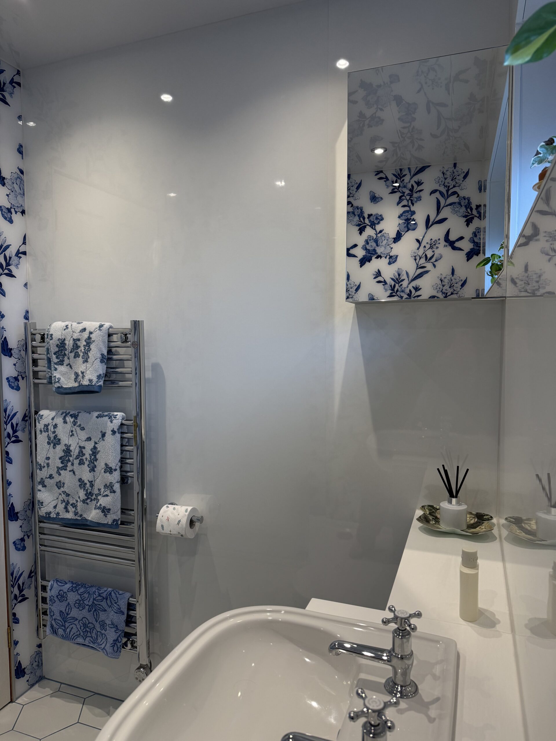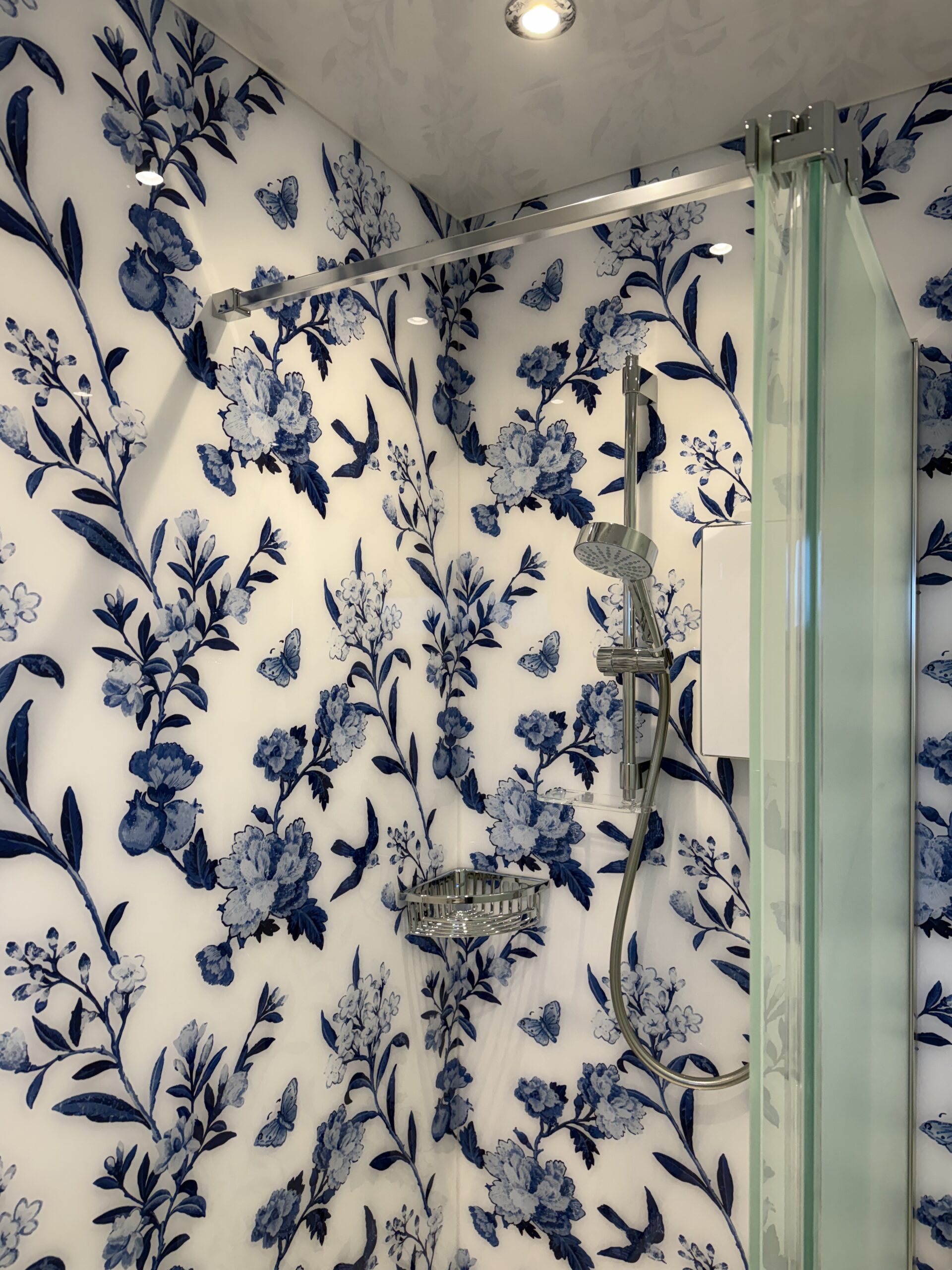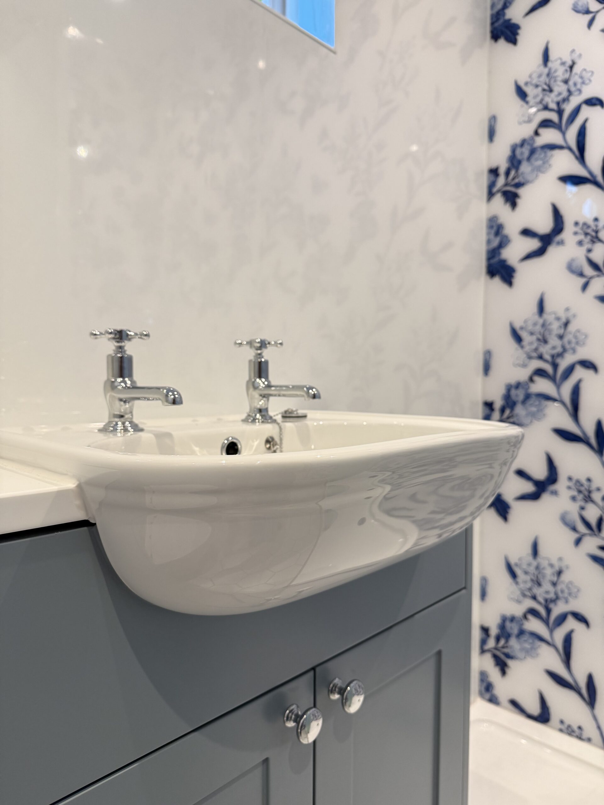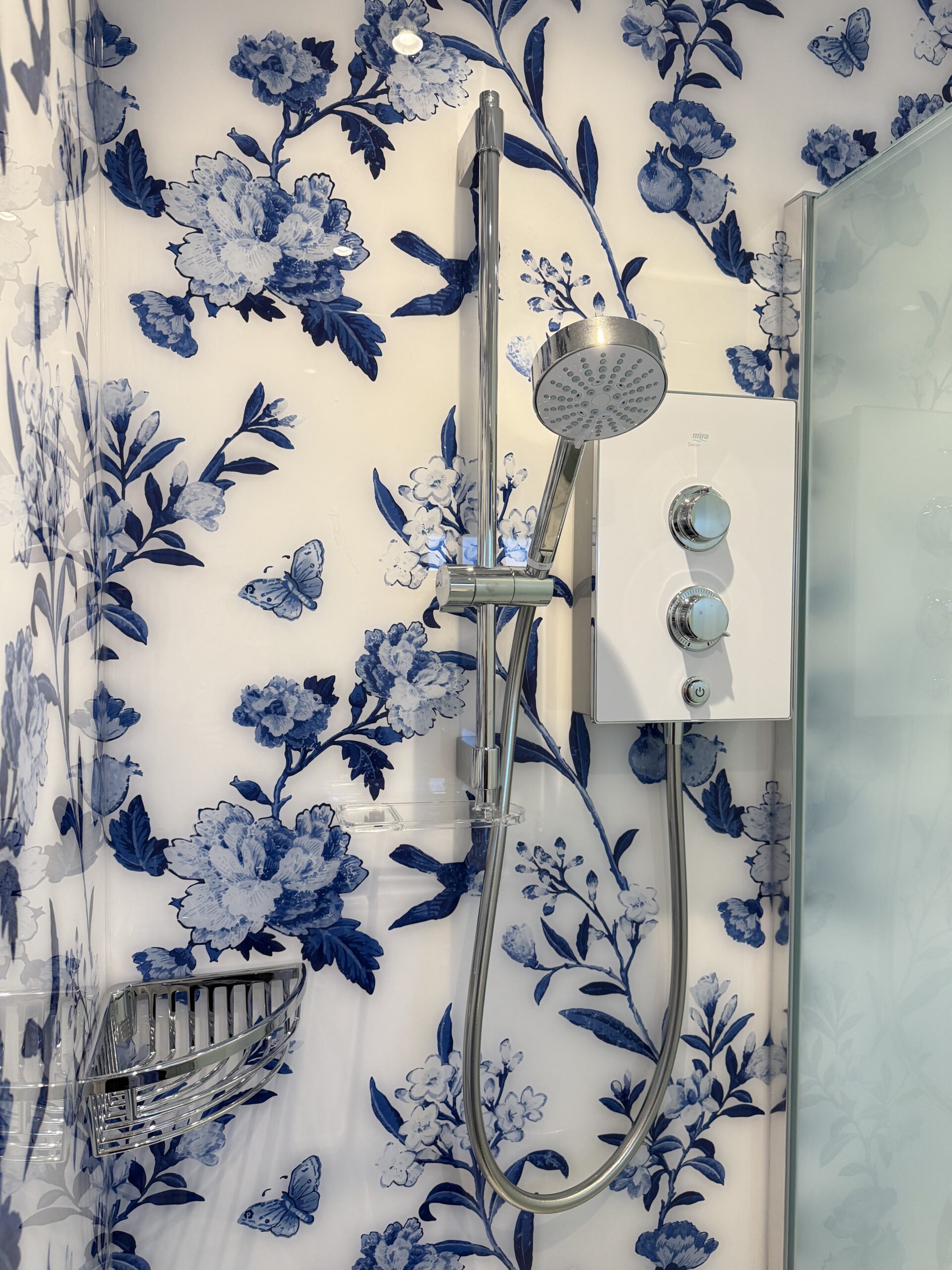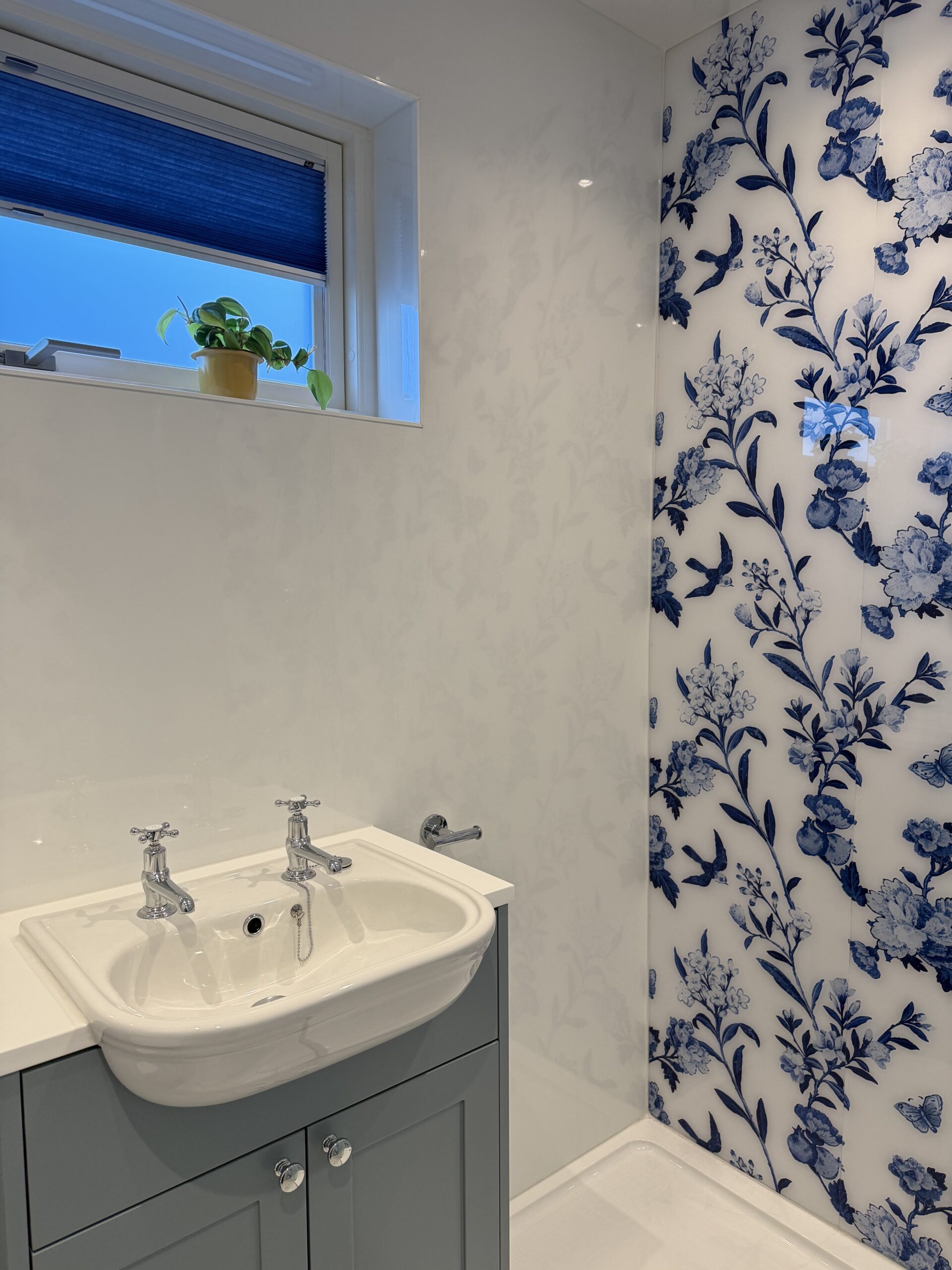 This elegant shower room renovation in Kirknewton blends classic charm with fresh, contemporary detailing to create a bright, uplifting space with a distinctly boutique feel. The design centres around a striking shower wall in Vintage China, where rich blue florals introduce depth, character, and a refined sense of artistry to the room.
