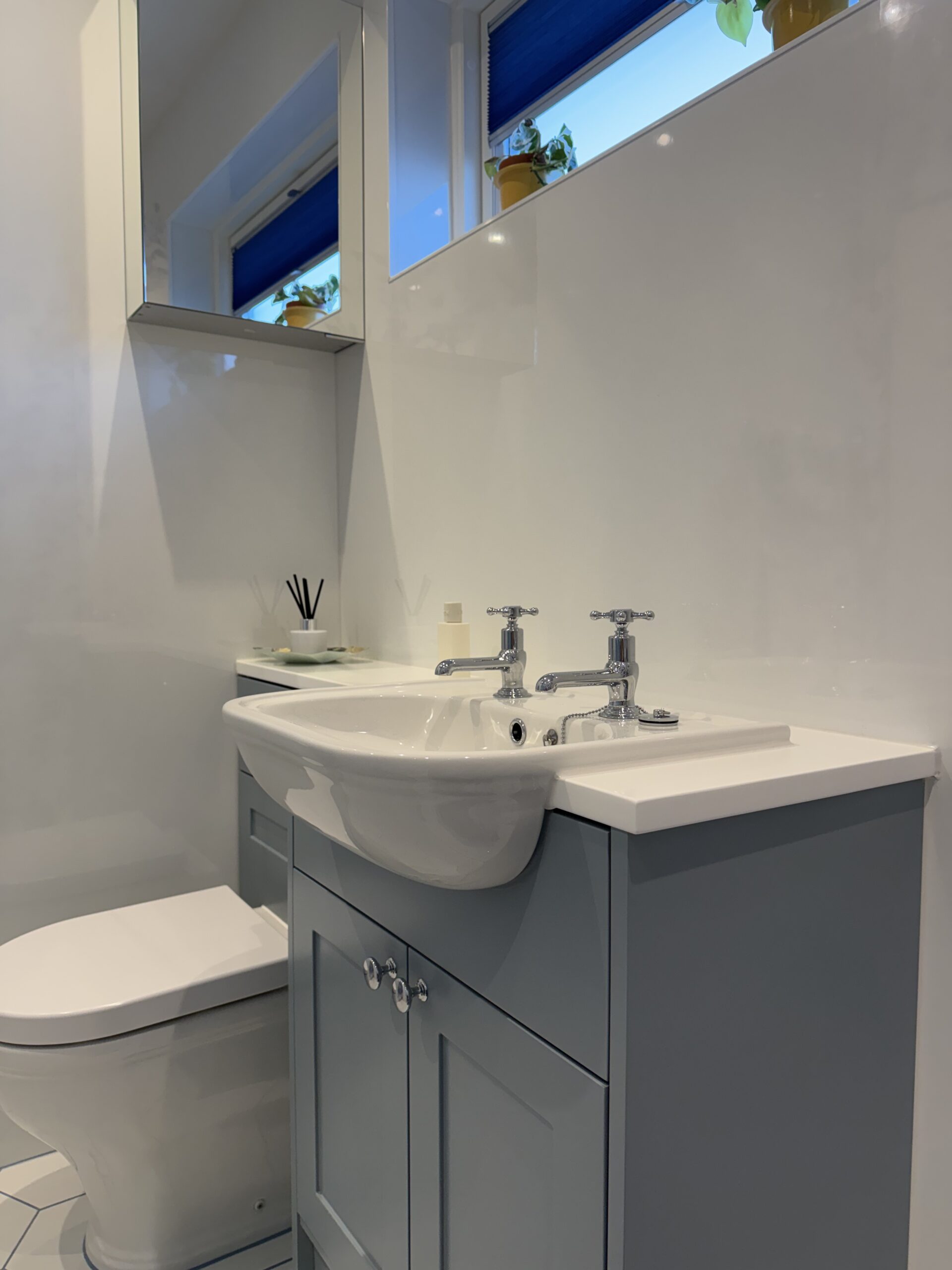 Across the rest of the room, high-gloss white wall panelling reflects light beautifully, creating an airy, seamless environment that feels both calm and expansive. The semi-countertop basin and Mineral Blue furniture add subtle colour harmony, echoing the tones of the feature wall while maintaining a clean, sophisticated palette.