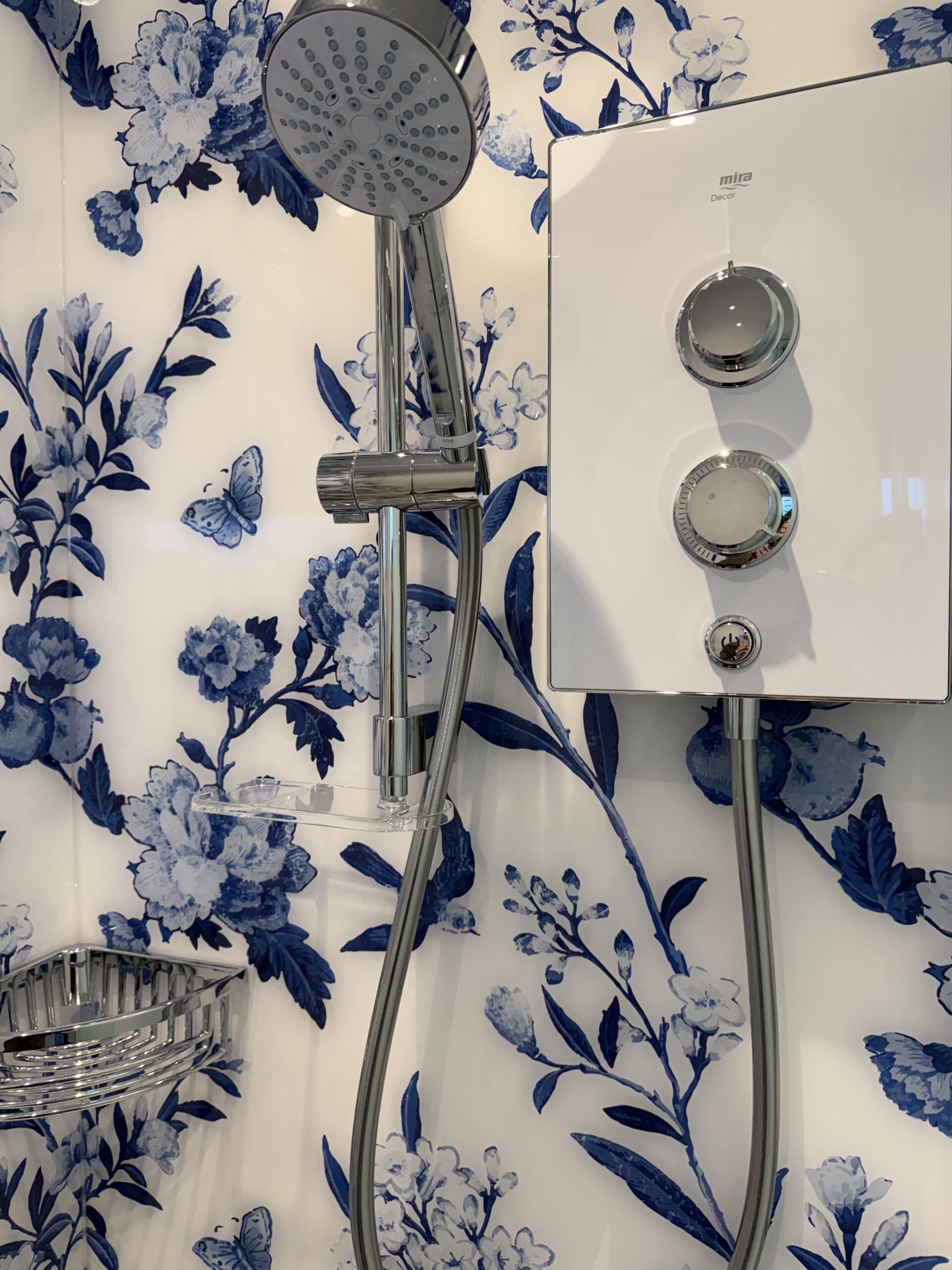A sleek Mira Decor electric shower sits proudly against this statement backdrop, paired with polished chrome brassware and accessories that enhance the crisp, modern aesthetic. The spacious walk-in shower is framed by minimalist frosted glass panels and complemented by thoughtfully placed storage, balancing practicality with an uncluttered visual flow.