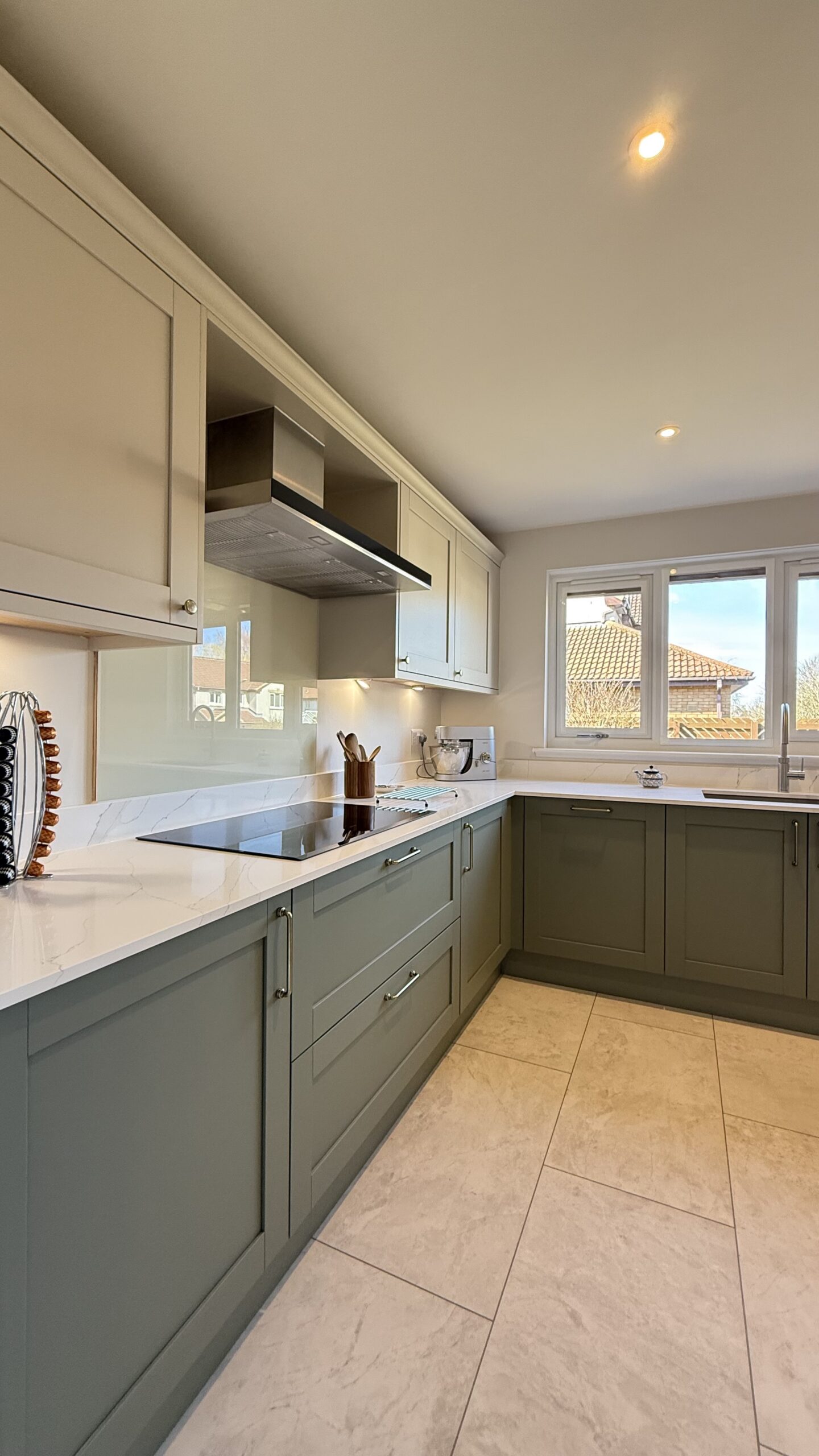 Designed using the Masterclass Kitchens Padstow range, the space combines soft Willow and Highland Stone tones to create a beautifully balanced, neutral palette. The cabinetry is complemented by warm Portland Oak interiors, adding subtle depth and a premium feel throughout.