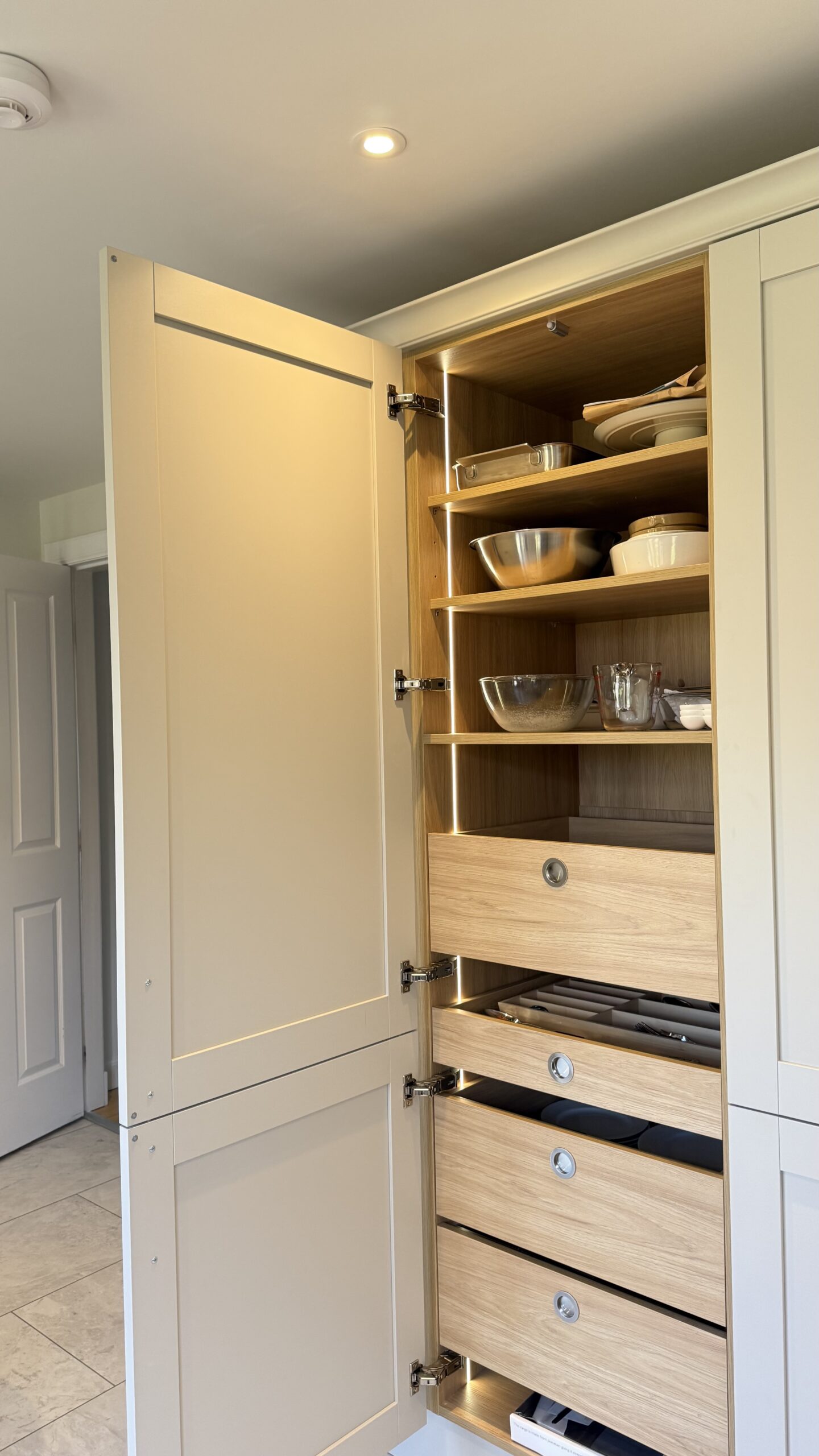 Practicality is at the core of the design, with generous storage solutions including larder units, deep pan drawers, and integrated appliance housing. Clean lines and traditional shaker detailing are enhanced by carefully selected handles, delivering a refined yet highly functional finish.