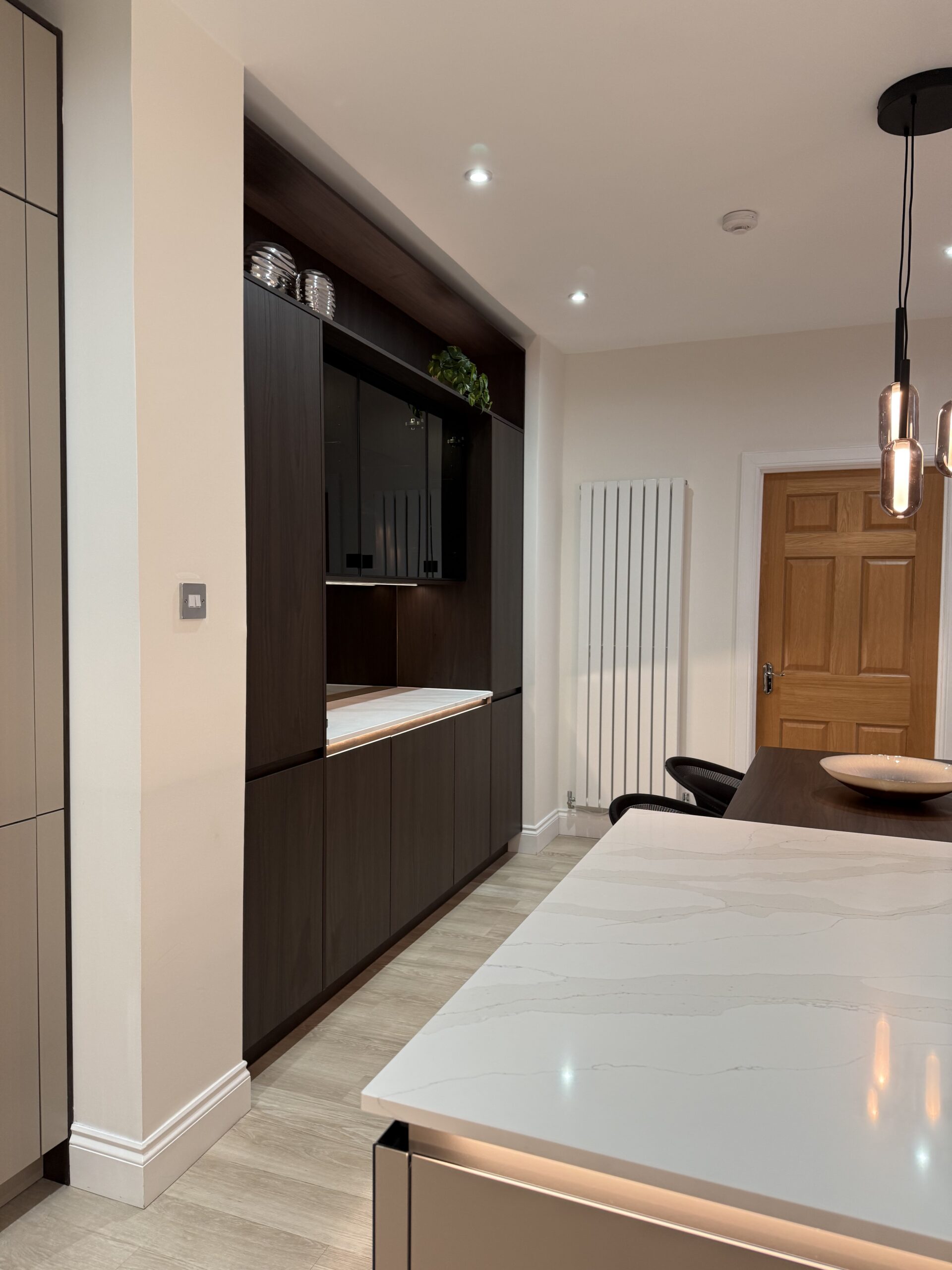 A standout element of the design is the bespoke glass unit bar and coffee area. Finished with tinted bronze mirror detailing, this zone brings a touch of hotel-style luxury while remaining highly functional – perfect for morning coffees or evening drinks. Nearby, an integrated wine fridge is seamlessly built into the island run, keeping bottles close at hand while maintaining the clean aesthetic.