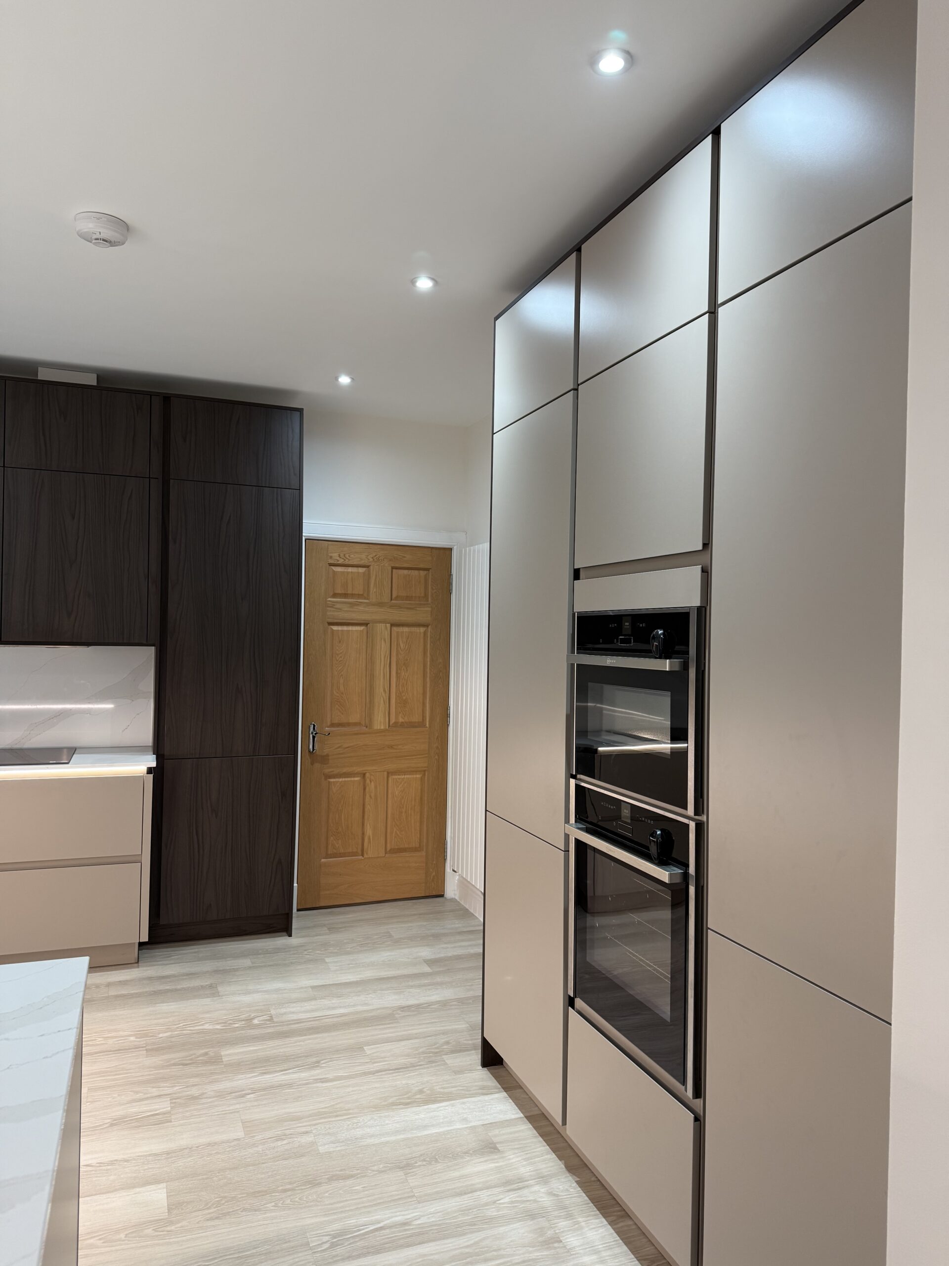 This contemporary kitchen project in West Lothian is a refined balance of architectural design, layered lighting and beautifully considered materials. Designed using the Pronorm Y-Line handleless range, the space pairs soft, modern neutrals with rich, tactile finishes to create a kitchen that feels both luxurious and effortlessly liveable.